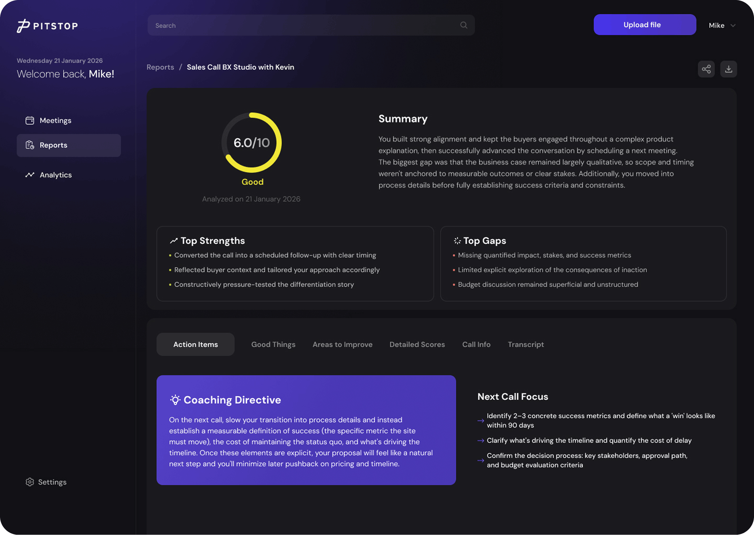 Pitstop is the first execution governance platform built specifically for this purpose. It performs structured execution audits across discovery depth, deal control, qualification risk, buyer urgency, competitive positioning, and close momentum. Within minutes of every call, the rep receives concrete direction before the next conversation begins.