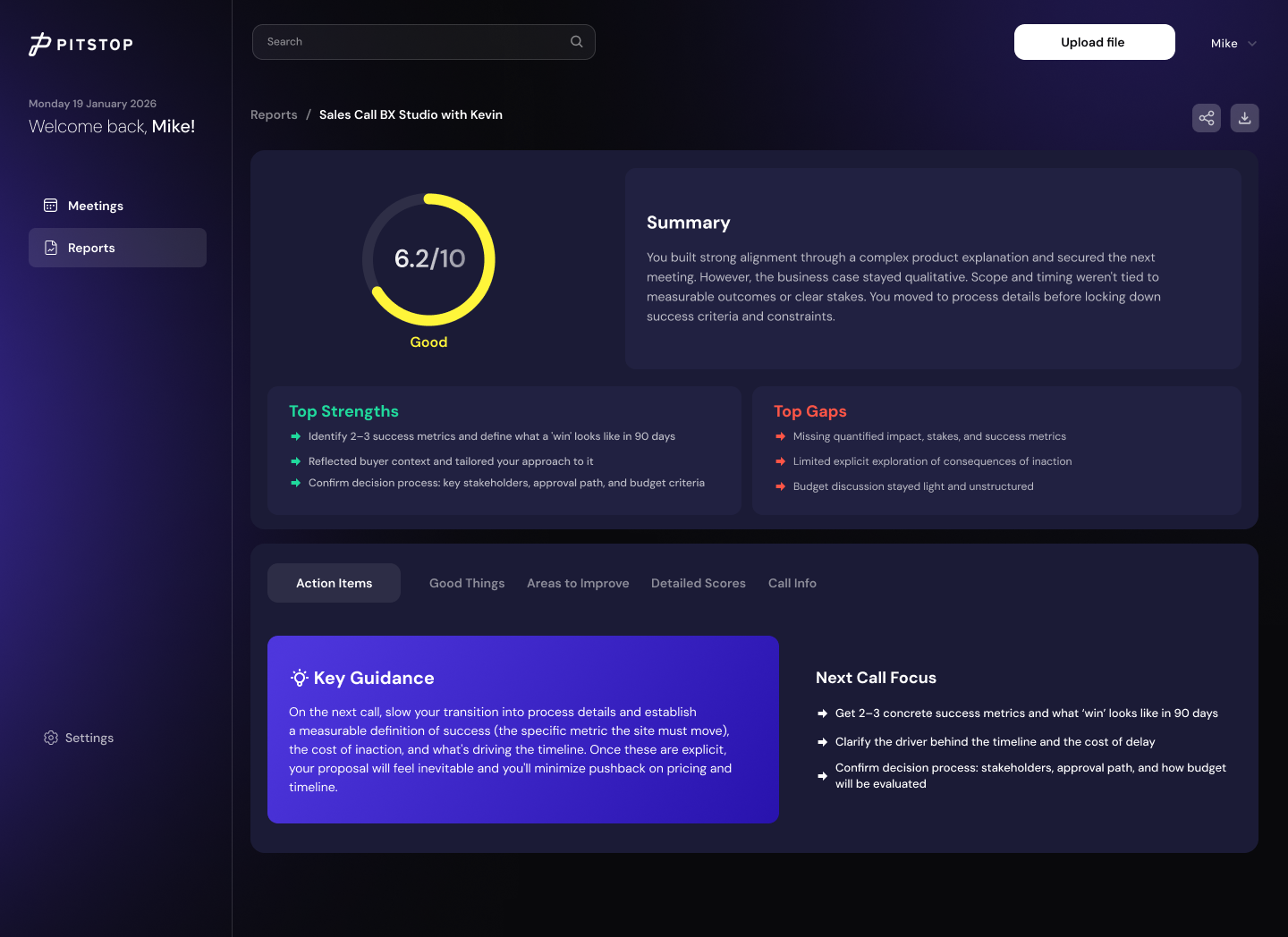 Pitstop performs structured execution audits across every sales conversation. Within minutes of a call, the rep receives a structured execution report highlighting strengths, gaps, and prioritized next-call focus areas. This is not a dashboard. It is not a coaching note for a manager to schedule. It is actionable guidance for the next conversation.